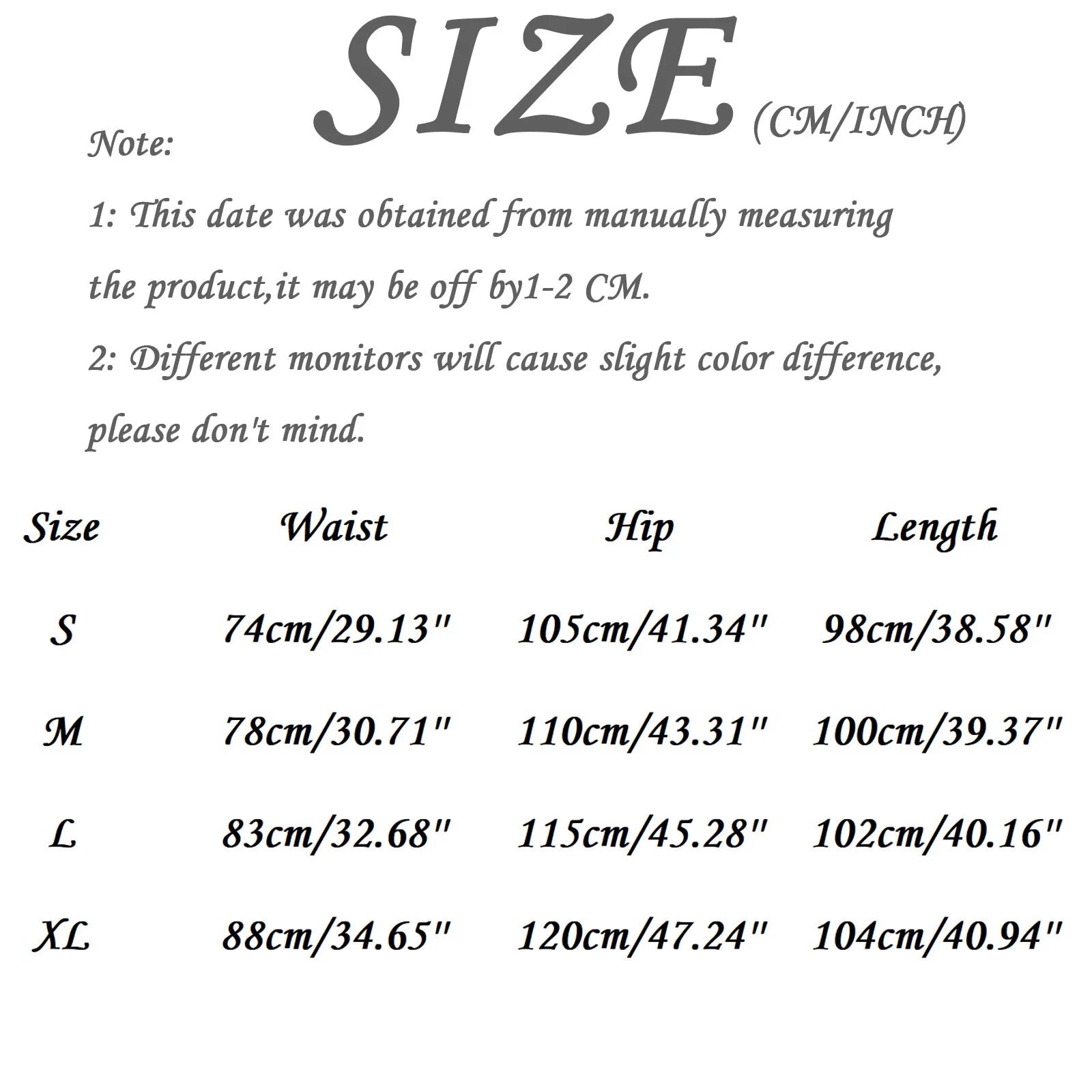 | Size:S | Waist:74cm/29.13'' | Hip:105cm/41.34'' | Length:98cm/38.58'' |